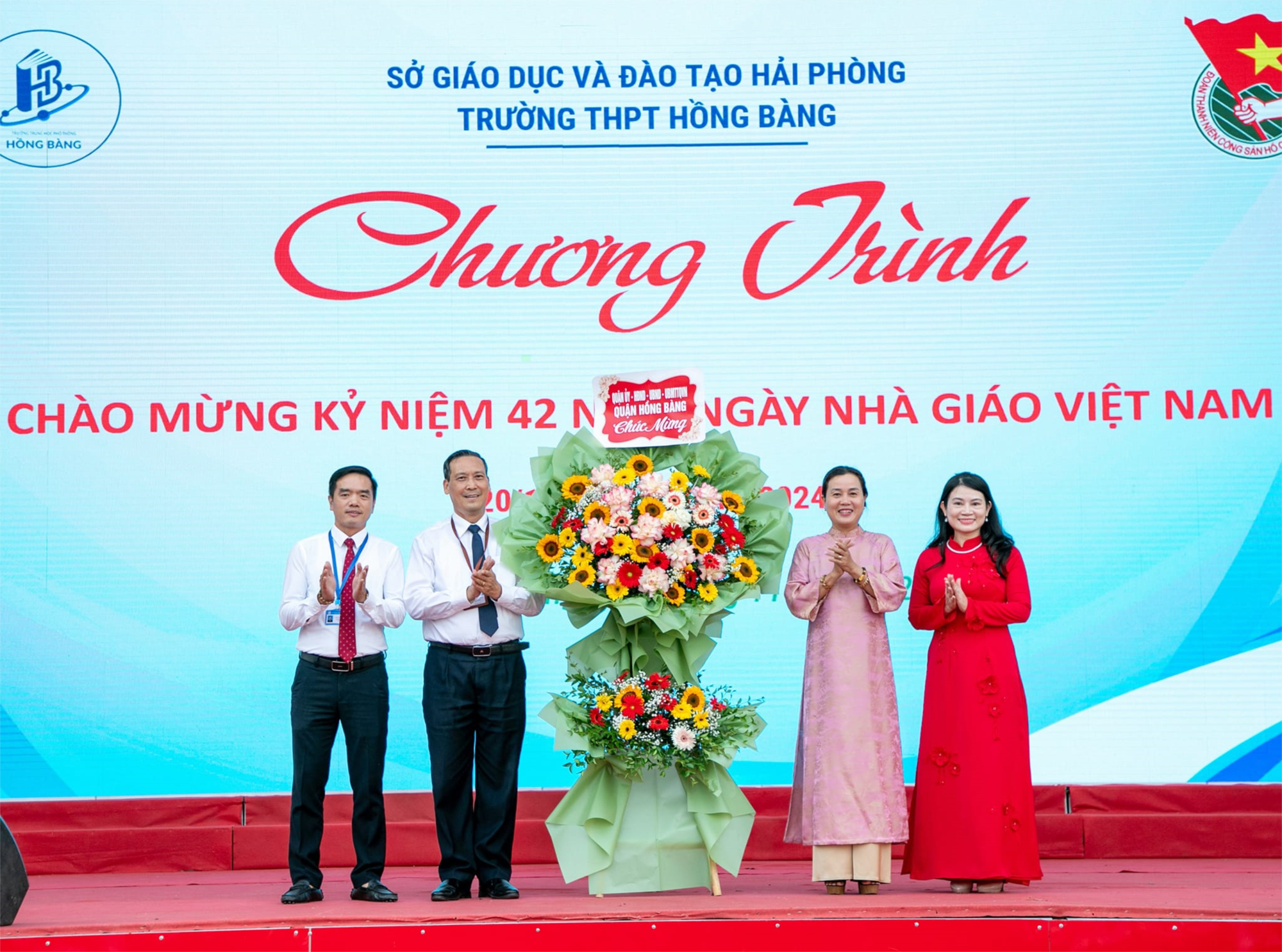 Chiều 19/11/2024, Trường THPT Hồng Bàng tổ chức Chương trình kỷ niệm 42 năm ngày Nhà giáo Việt Nam 20/11. Chương trình gặp gỡ các thế hệ nhà giáo, vinh danh, khen thưởng giáo viên, học sinh có thành tích xuất sắc nhằm tuyên truyền trong toàn thể cán bộ, giáo viên, nhân viên, phụ huynh và học sinh về ý nghĩa ngày Nhà giáo Việt Nam 20/11; khơi dậy truyền thống “tôn sư trọng đạo”, lòng tự hào, yêu nghề; tăng cường sự đoàn kết, gắn bó tình cảm của các thế hệ cán bộ, giáo viên