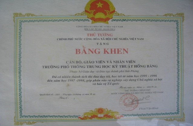 + Năm học 1996 - 1997 Đoàn trường được nhận cờ Đơn vị dẫn đầu phong trào thanh niên khối trường học thành phố do Thành đoàn Hải Phòng trao tặng.