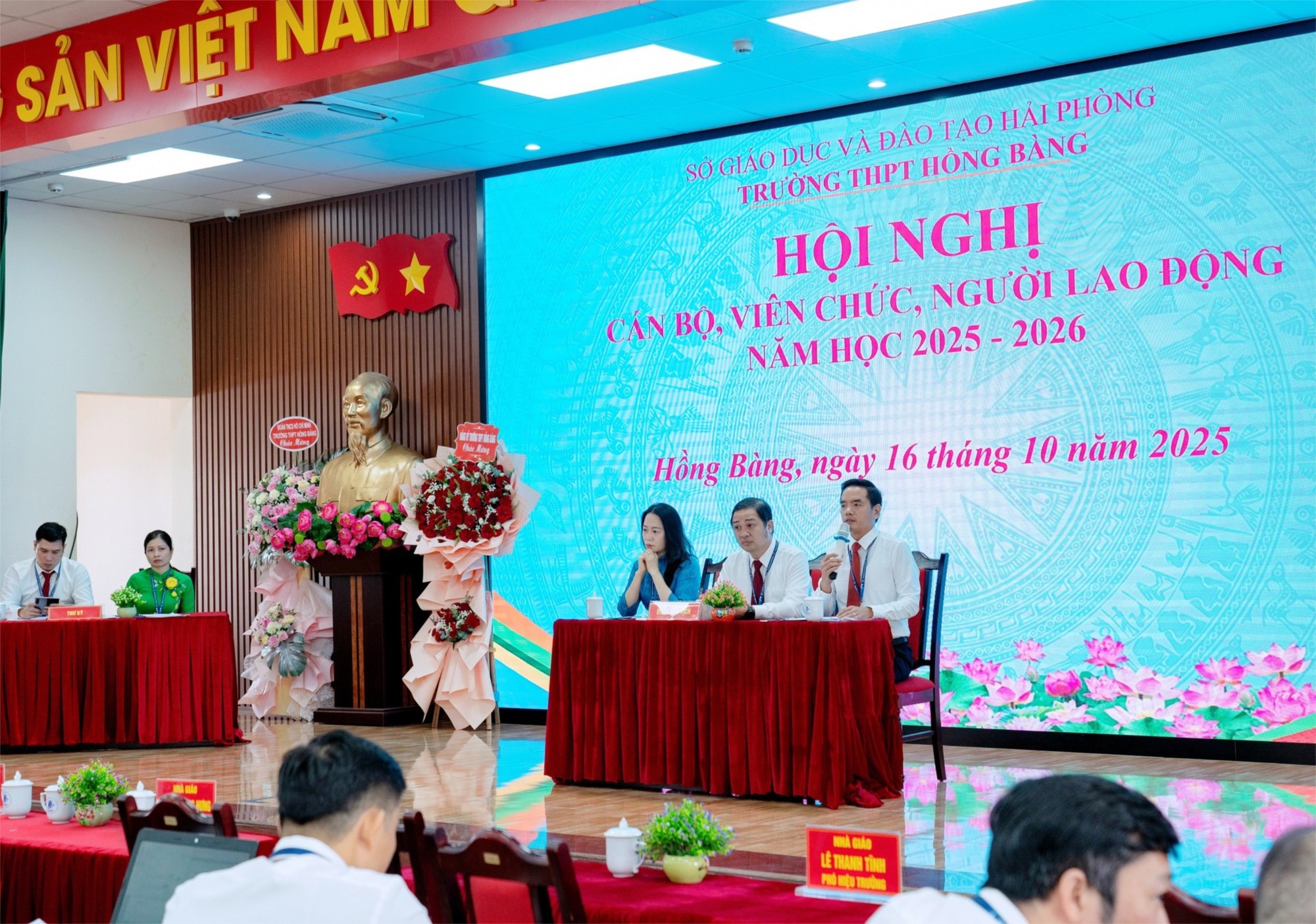 Sáng ngày 16/10/2025, trường THPT Hồng Bàng đã tổ chức Hội nghị Cán bộ - Viên chức và Người lao động (CB-VC-NLĐ) để đánh giá lại những kết quả đạt được, vấn đề còn tồn tại trong hoạt động sư phạm của nhà trường năm học 2024 – 2025, đồng thời thông qua phương hướng nhiệm vụ năm học 2025– 2026.